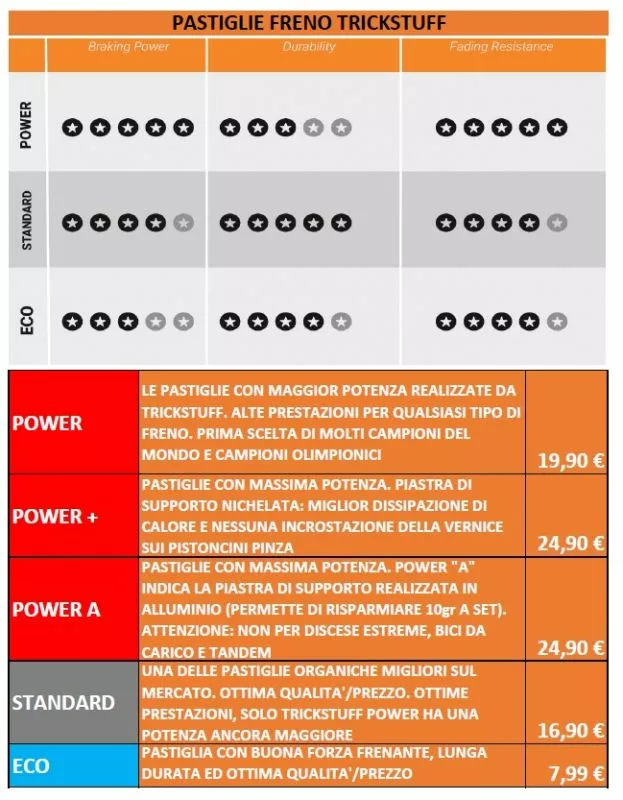 Tutte le pastiglie Trickstuff sono realizzate su un mix di materiali organici per ottenere un prodotto a basso rumore, bassa usura ed elevato potere frenante